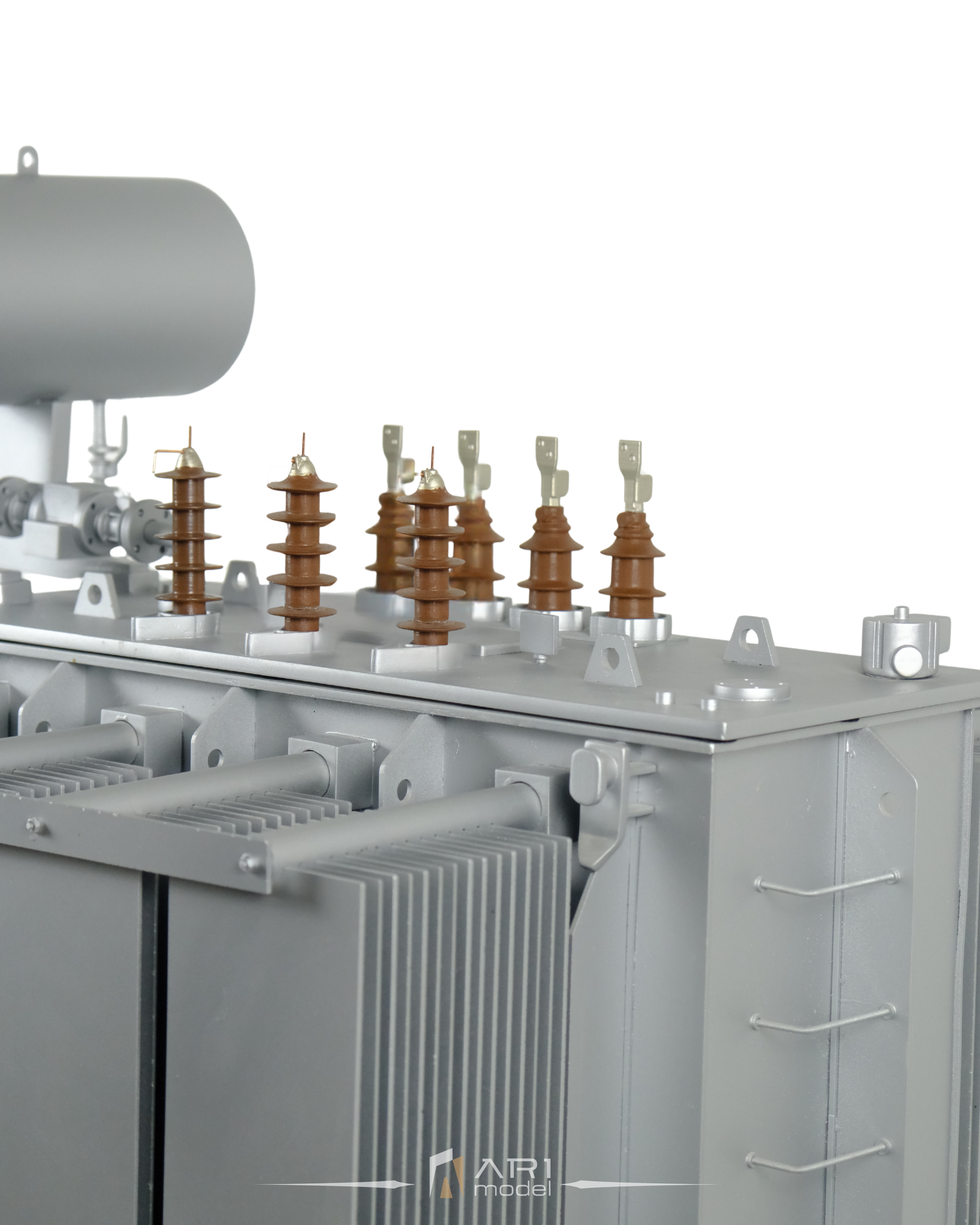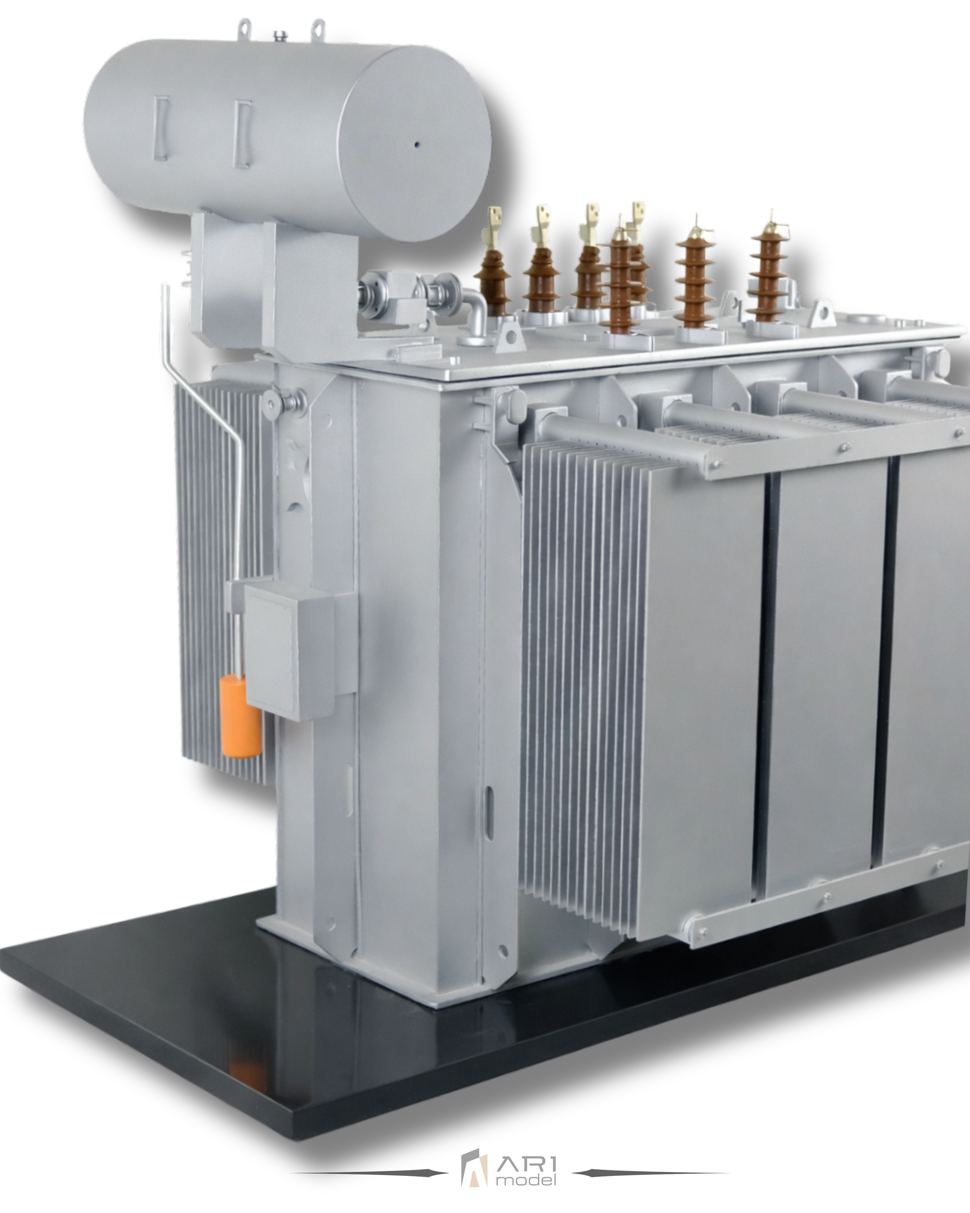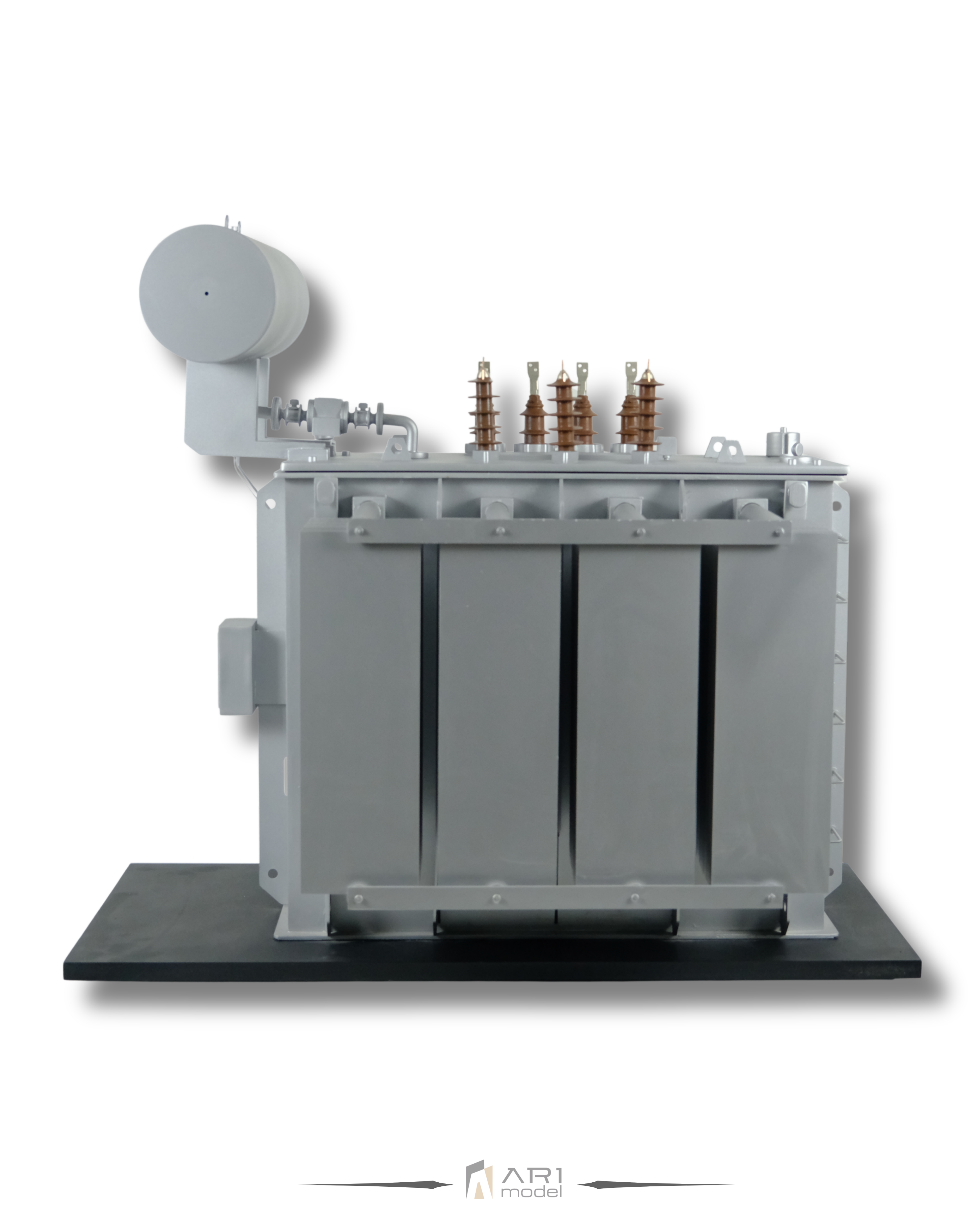 Every component of the transformer model developed by ARI Maquette is based on real technical references. From cooling panels and bushings to structural proportions, each detail reflects the logic of industrial design. Clean surfaces, accurate geometry, and balanced proportions ensure both realism and aesthetic clarity—core values of ARI Maquette’s modeling approach.